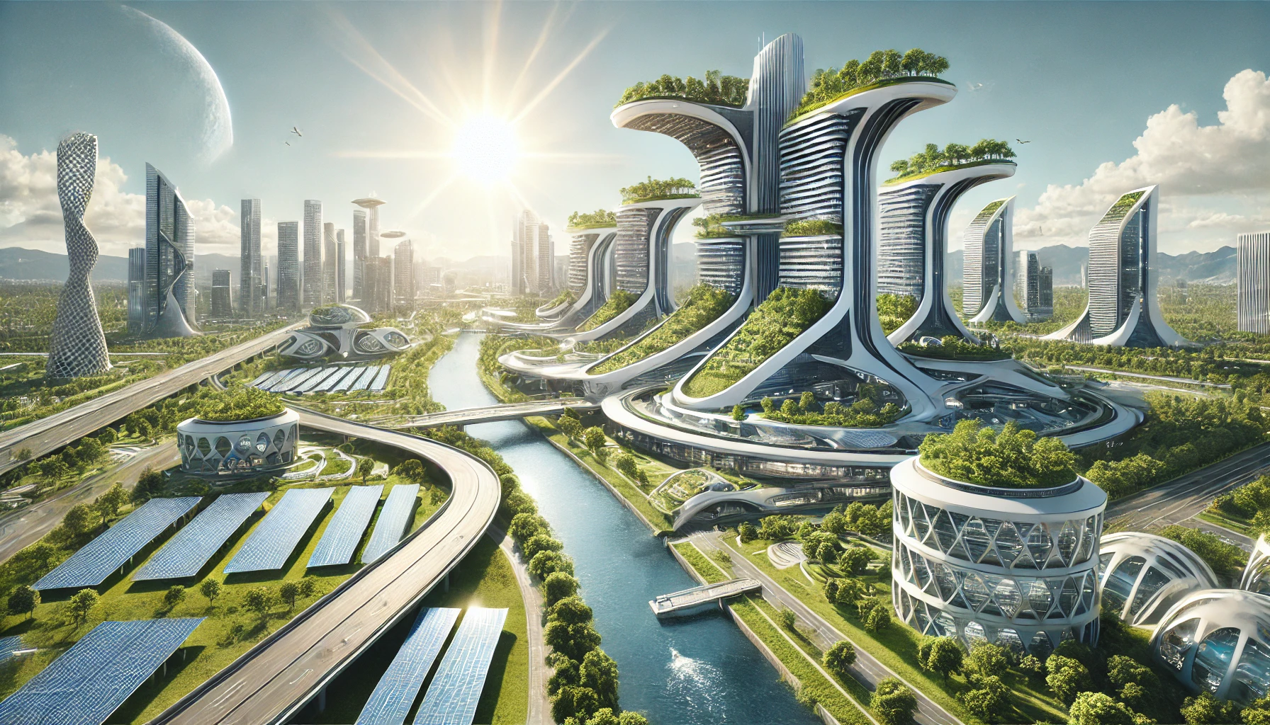 Cities organized around rivers are nothing new — Paris, London, Vienna all are, and most of urban history is the story of how to keep your river usable while also using it for everything. The image's contribution is that the modern eco-city version doesn't choose between those uses. The solar arrays don't compete with the riverbank for space; they're cantilevered over it. The buildings don't dump waste into the water; they use the water as a thermal mass for heating and cooling. The bridges aren't transportation infrastructure with vegetation as ornament; they're literally elevated greenways that double as crossings.