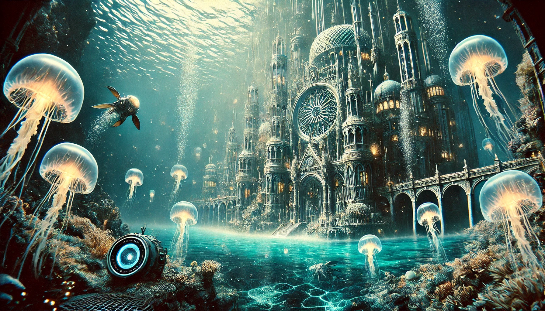 16:9 · 1792×1024 · midjourney-legacyWhat the image catches is a Gothic cathedral, fully underwater, with massive jellyfish floating around it like worshippers in slow procession. A sea turtle swims across the upper-left foreground. The architecture is unambiguous Late Gothic — pointed arches, flying buttresses, a rose window centered on the main facade. Bioluminescent coral grows up the cathedral's base. A small sphere — possibly a probe, possibly an air dome — sits at lower-left. The water-light is the cyan-green you get in clear tropical reefs at depth.