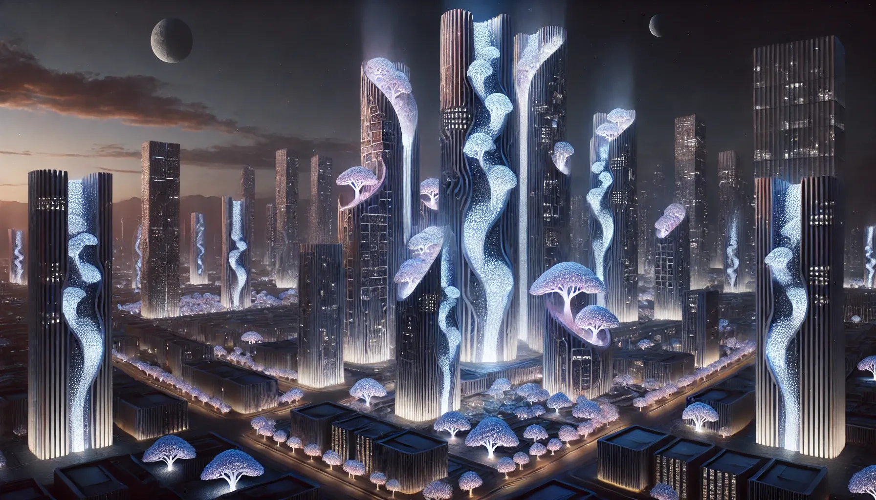 16:9 · 1792×1024 · midjourney-legacyThe arresting move in this image is the composite. Conventional rectangular skyscrapers stand against a night sky. Out of the sides of those skyscrapers — at varying heights, scaled bigger than balconies but smaller than the buildings themselves — bioluminescent mushroom-coral forms have grown, glowing soft white-purple. They aren't structures attached to the buildings. They look more like the buildings have been infected, or hosted, or seeded. At ground level, smaller pink-stemmed mushroom-trees grow between conventional streets and shops. Two moons hang in the sky.
