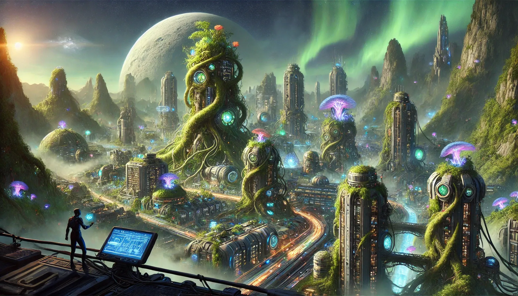 16:9 · 1792×1024 · midjourney-legacyThe detail at the lower-left changes the image. A small figure stands on a metal balcony, hand near a softly-glowing control panel, looking out across a vast biopunk city — vine-overgrown towers, jellyfish-shaped mushrooms hovering at building height, glowing teal data-channels weaving through the streets. The sky above the city is filled with green aurora; a large white moon hangs at the horizon. The figure with the control panel is on our side of the bridge. The viewer is, structurally, looking over their shoulder.