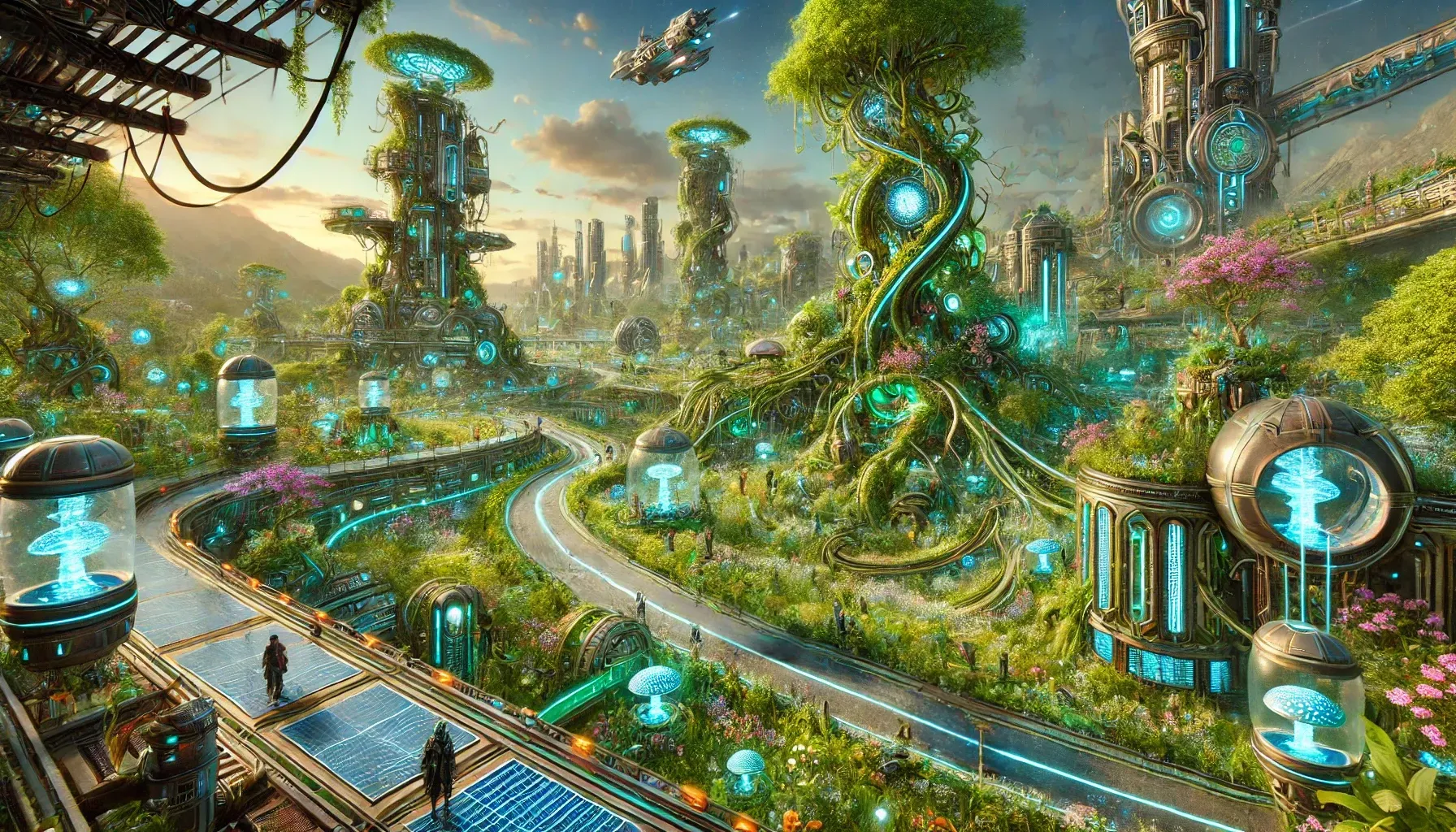 The surrounding city is dense — a massive central organic structure (more tree than building, but partly tower), curved walkways climbing terraces, glowing cyan tech-clusters at intersections, solar panels at the lower-right. There's a hovering vehicle in the upper distance. Pink and white flowers crowd the path edges. The sky is an active dawn. A wind turbine spins at the upper left edge. None of this matters quite as much as the two figures walking. The city is the context. The walk is the reason the city exists. Most utopian-future imagery loses this; this one keeps it.