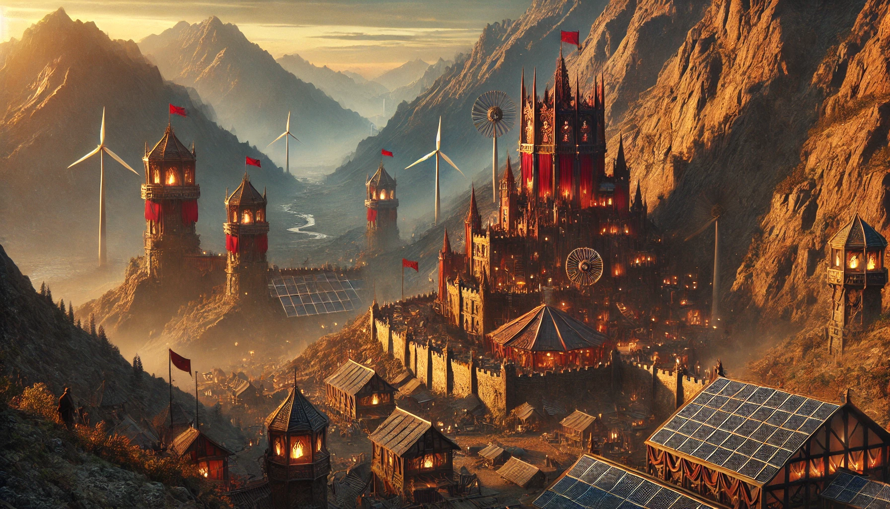 The image's fortress carries the architectural weight of a real medieval city — black-and-red banners, gothic spires, a tented encampment in the foreground that reads as travelers or pilgrims. The solar panels on the lower-right roof are subordinate to the wind harvest; they're additive, not central. Golden-hour light flattens the desert tones into something close to monochrome, which is the ideal register for an image whose argument is about continuity rather than rupture.