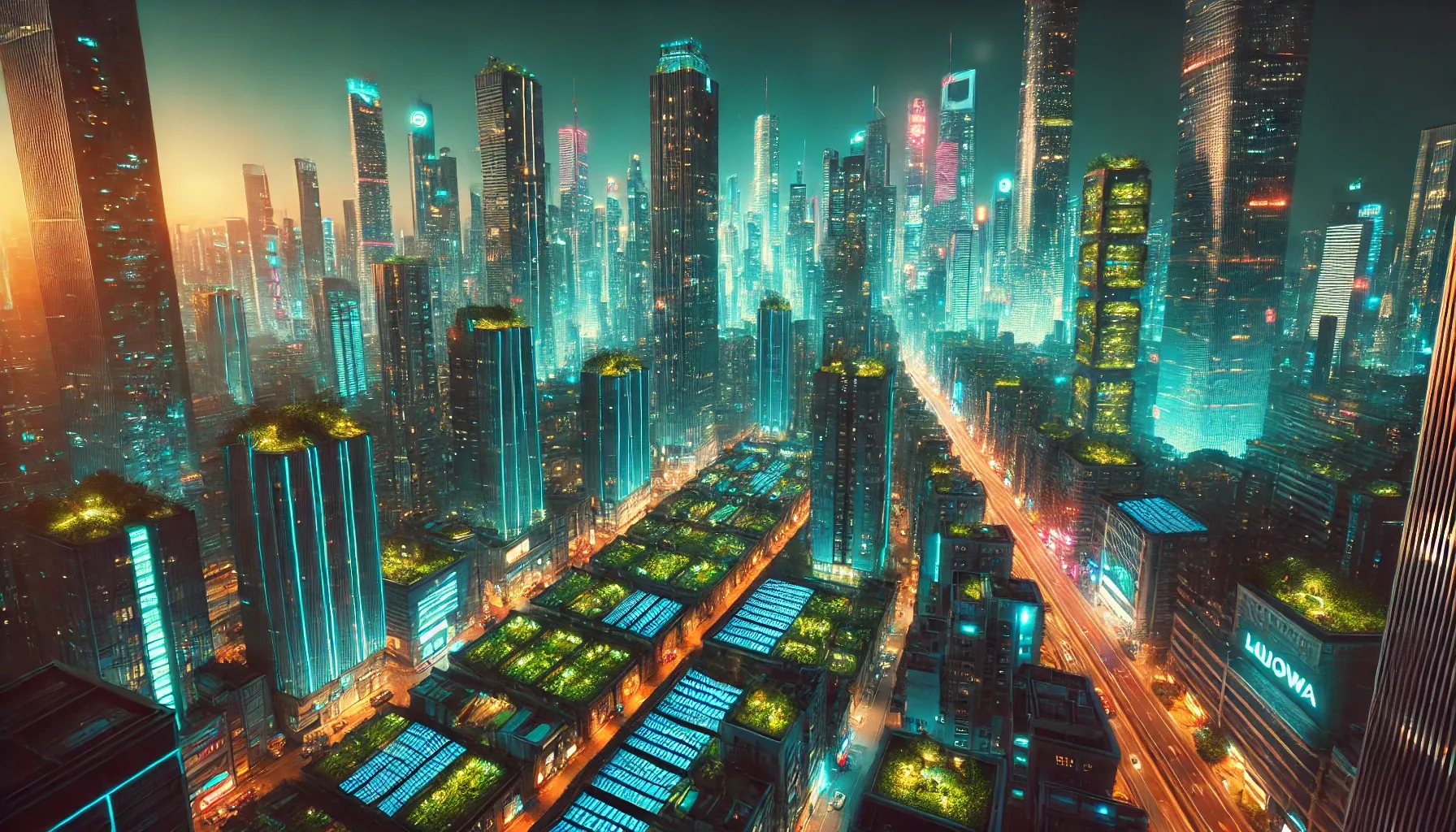16:9 · 1792×1024 · midjourney-legacyThe vantage point is high — possibly twenty stories above street level — looking down across a dense cyberpunk skyline at night. The conventional cyberpunk elements are all present: cyan-magenta light pollution, mid-rise to high-rise mixed density, neon billboards on dozens of buildings, light trails on a curving roadway, faint atmospheric smog. What's unusual is the rooftop layer. Every visible rooftop has been farmed. Vegetable beds, solar panels, fruit trees, wind turbines, all packed onto the flat tops of buildings that were originally designed for HVAC equipment.