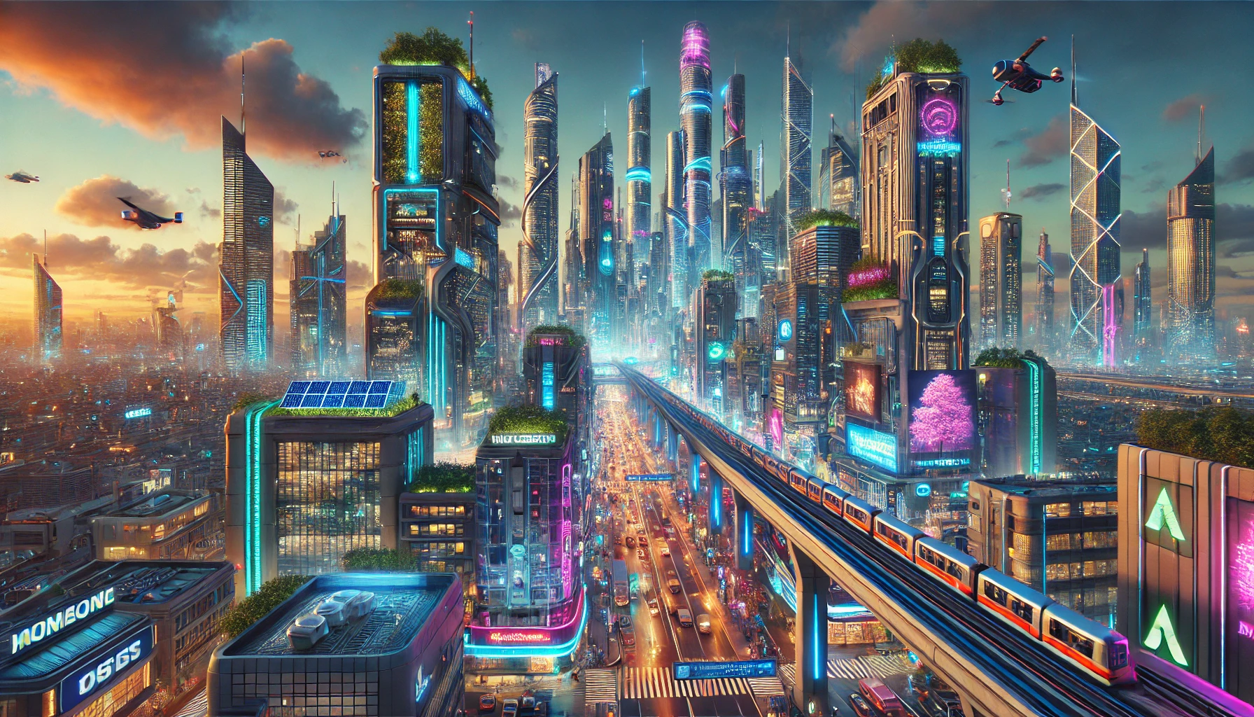 What the image catches is a city with all the cyberpunk architectural moves — the mile-high mixed-use towers, the magenta and cyan billboards, the elevated maglev train cutting through the middle, the cluster of low-altitude personal aircraft — but rendered under a sunset-gold sky. Solar panels are visible on the lower-floor terraces. Greenery climbs the side of the closer towers. The maglev itself is painted in the same magenta as the dominant signage, blurring the line between transit infrastructure and brand surface.