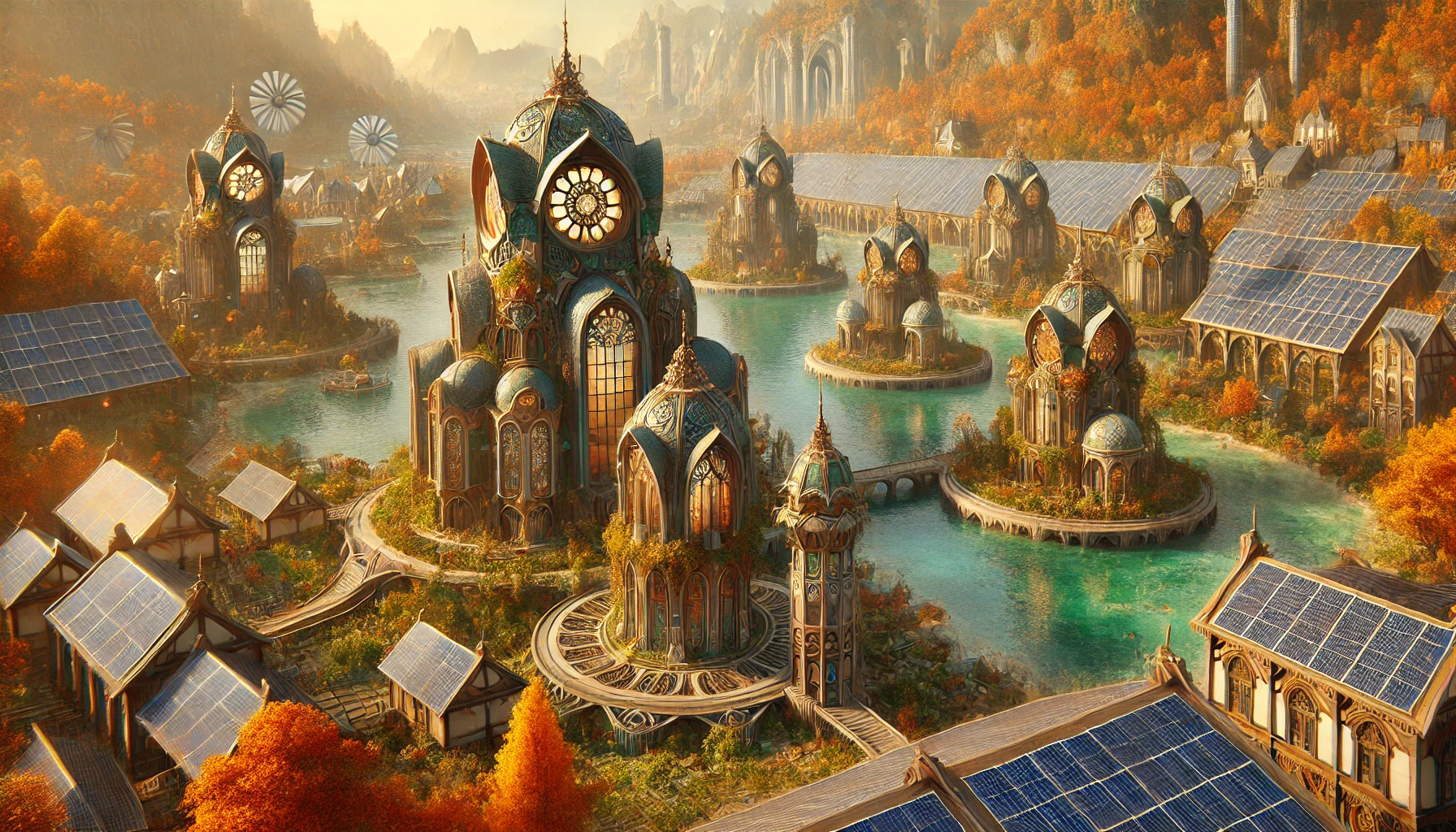 16:9 · 1792×1024 · midjourney-legacyThe image's real subject is the water. A handful of small islands hold an Art Nouveau settlement — tall ornate spires, copper-domed cottages, formal stained-glass windows on the central tower — and the islands are small enough that water is in every frame. Solar panels appear on practically every cottage roof, but they're sized for the buildings, not stacked beyond what the architecture asks for.