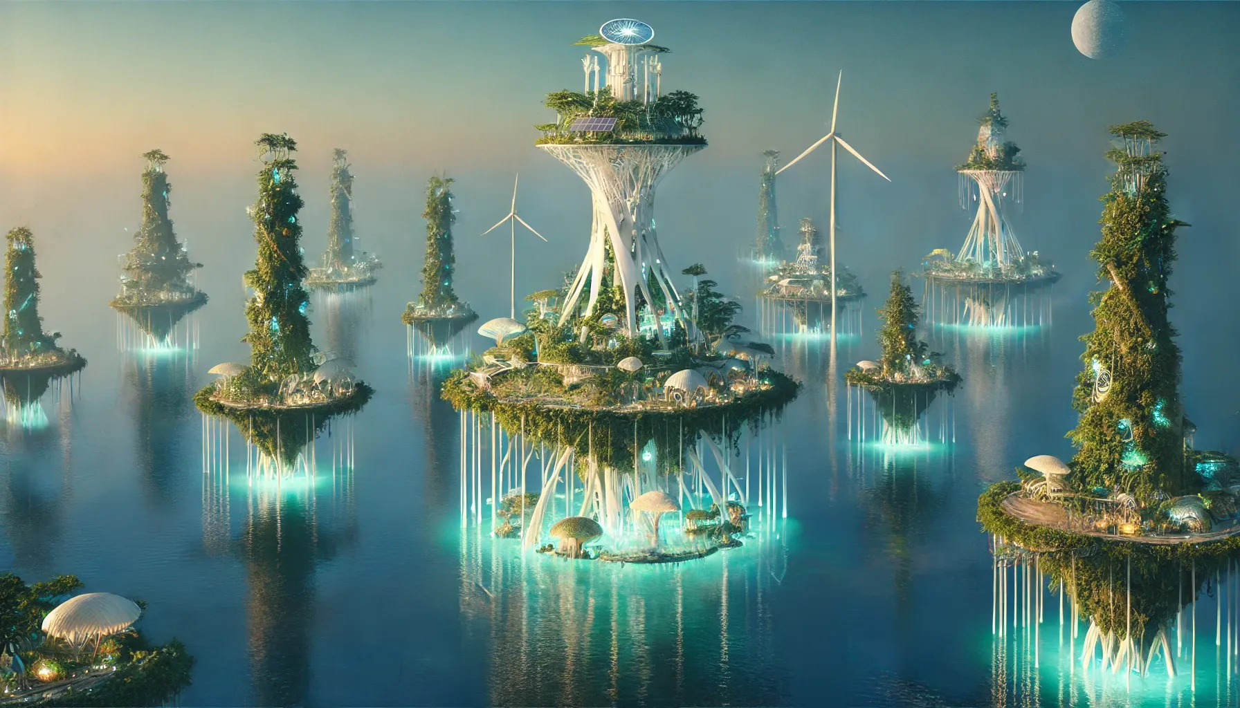 16:9 · 1792×1024 · midjourney-legacyThe architecture in this image is genuinely strange. A loose constellation of upside-down stone-and-tree pyramids hover above a still water surface. Each pyramid is overgrown with greenery — vines, small forests on its top surface, mushroom-like white forms growing on its sides — and emits a steady cyan light from its base, descending in a column down to the water. Wind turbines stand among the pyramids, scaled small. The water is glass-flat and reflective.