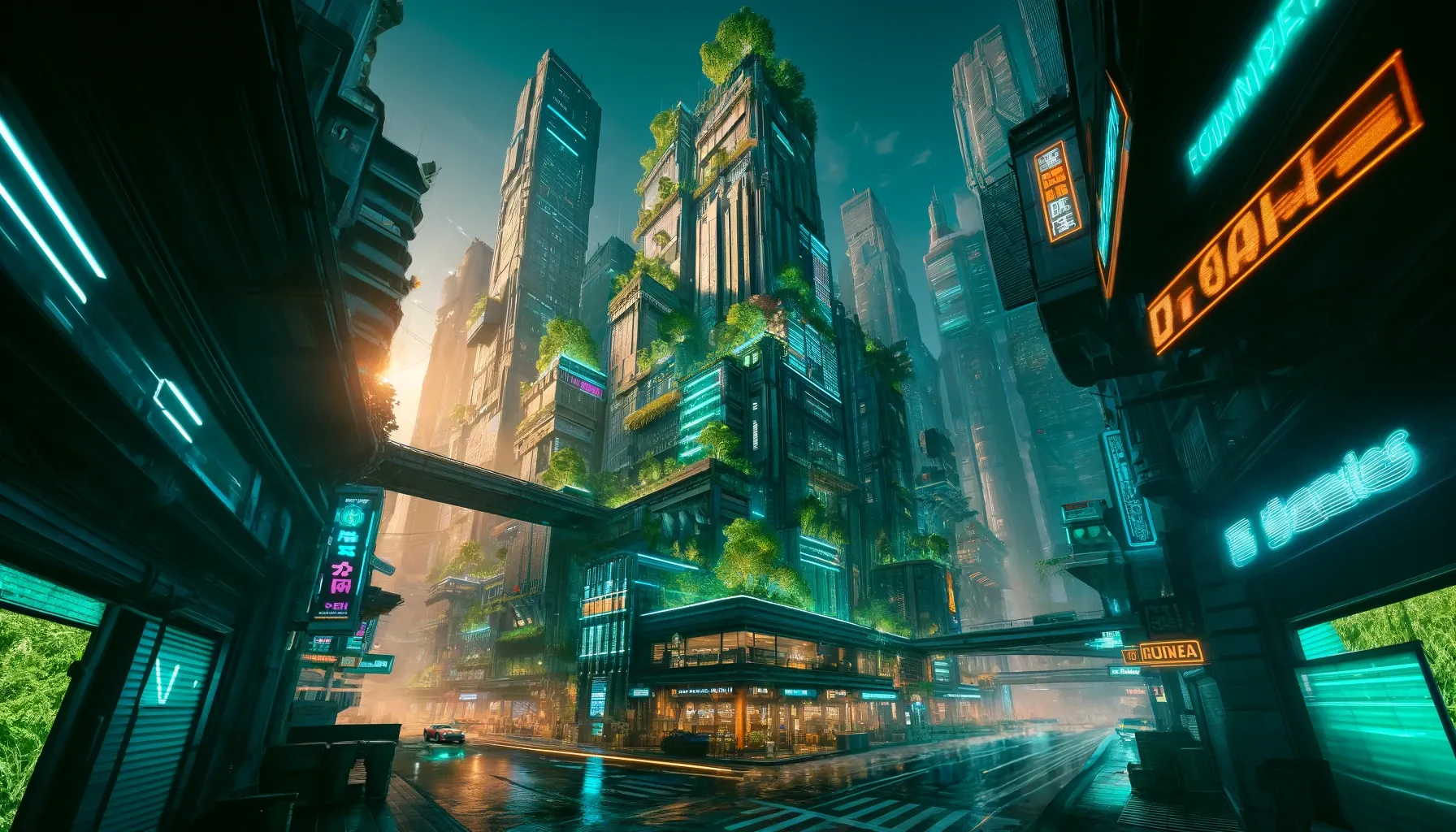 The vine-cascade move is doing two things at once. First, it reads as ecological retrofit — somebody installed planters at every level and let the plants do the rest. Second, it reads as post-collapse — the buildings are being slowly reclaimed by something that wasn't part of the original design. The image lets both readings stand. The neon signs are still working, which suggests inhabitants. The vine cascade is dense enough that maintenance is happening. Whoever lives here has decided the plants belong.