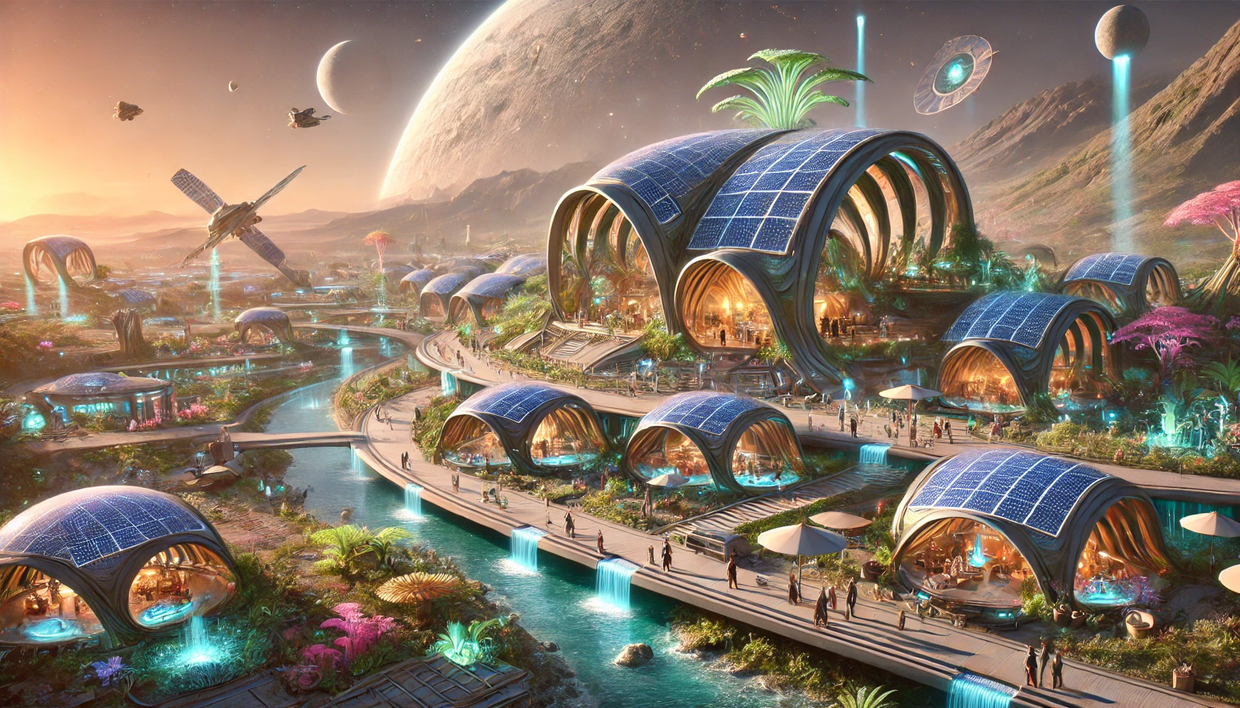 The arched-vault solar dome is interesting architecture. Most solar-panel buildings on Earth are either flat-roofed or use angled rooftop arrays — both compromise on either solar capture or interior volume. A barrel-vault topped with curved photovoltaics solves both: the curve catches sun across more of the day (you don't need to angle the panels because the building does), and the interior gets full ceiling height. The closest real-world analog is the inflatable solar canopy systems being prototyped for Mars habitats by Bigelow Aerospace and (more recently) ICON, the 3D-printing construction company contracted to develop NASA's lunar Habitat-3D project. None are quite like this image's vaults, but the design logic — curved surface, integrated photovoltaics, single internal volume — is real.