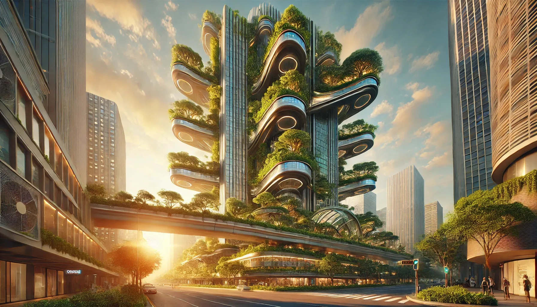 The golden-hour lighting is the editorial flourish. Most polished green-architecture renders use either neutral daylight (which is honest, but boring) or sunset gold (which is sentimental, but persuasive). This image picks sunset gold and commits. The pedestrian bridge connecting at mid-height is a small honest detail — green architecture only works if it's connected to other buildings, walked between, used as urban infrastructure rather than admired as one-off landmark. The bridge admits this is a city block, not a sculpture. The crosswalk in the foreground admits people walk here. The building exists for them.