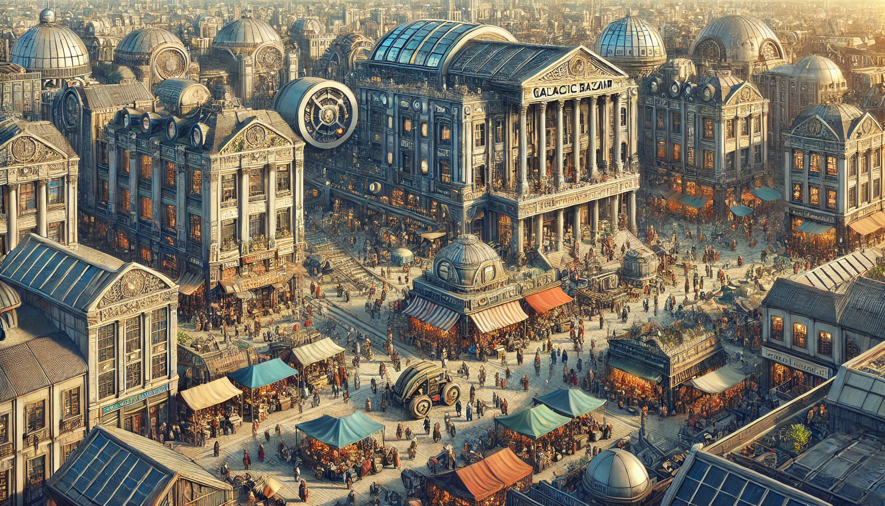 16:9 · 1792×1024 · midjourney-legacyWhat works about the image is that it locates galactic commerce somewhere oddly cozy. The bazaar isn't a spaceport or a corporate trade floor — it's a Victorian-era arcade, a glass-roofed atrium with stalls underneath, the kind of structure that was built across European capitals between 1840 and 1890 to enclose street markets without losing their character. Galleria Vittorio Emanuele in Milan, GUM in Moscow, the Burlington Arcade in London. The Galactic Bazaar borrows that vocabulary and adds the implication of arrivals from elsewhere.