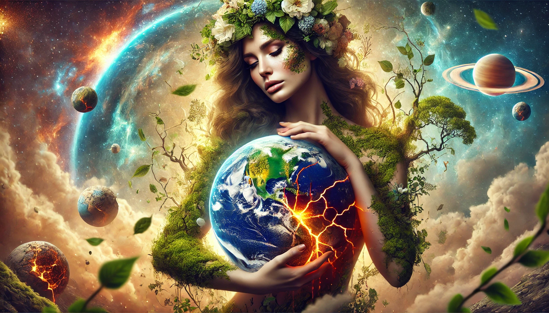 16:9 · 1792×1024 · midjourney-legacyThe image is unapologetically allegorical. A woman with a floral crown — Gaia, or Pachamama, or Bhumi Devi, the role has many names — cradles the Earth in her hands while a glowing fissure splits it open. Saturn floats behind her at impossible scale, suggesting that whatever frame we're viewing this in is mythological rather than astronomical. This isn't documentary. It's a campaign poster.