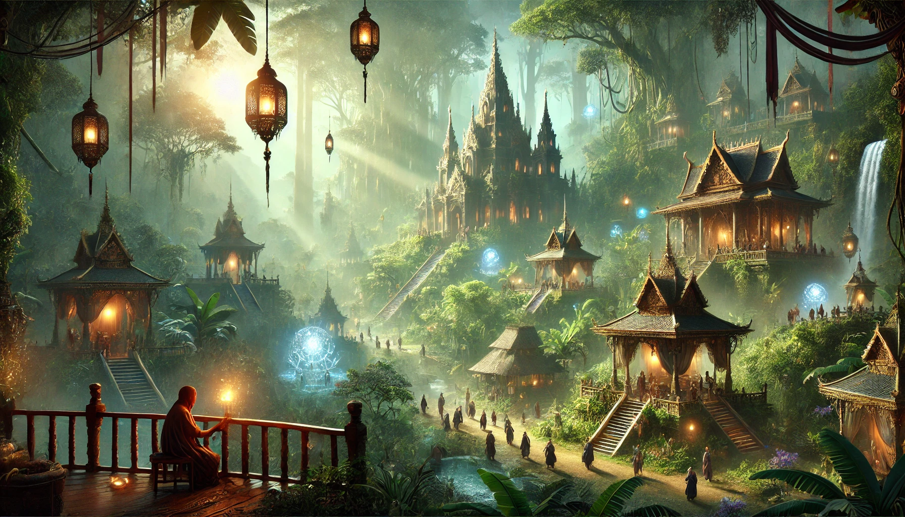 This is the most successful integration of magical fiction with culturally-specific architecture in the gallery. It earns the temple complex by treating it as a working place rather than a backdrop. The figure in the lower-left, alone on a balcony with a lantern, is the smallest detail and possibly the most important — they're not staring at the orb, just doing their evening.