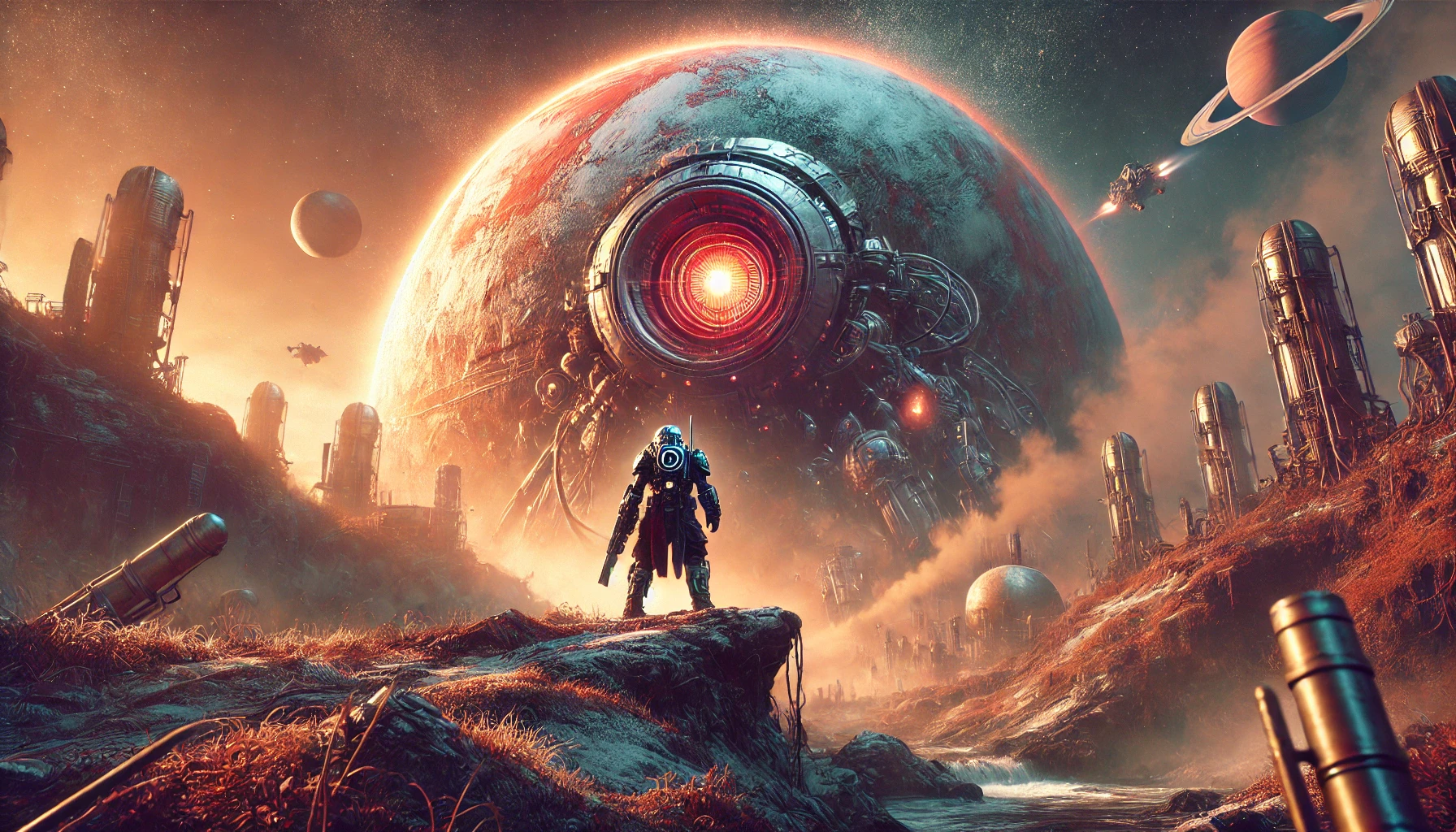 16:9 · 1792×1024 · midjourney-legacyThe composition stages a confrontation. A small armored figure stands on a rocky outcrop in the lower-left foreground, helmet on, weapon at their side. Looming directly in front of them is a colossal mechanical structure — partly a planetary body, partly a wheel-shaped space station, partly something else. A red optical lens or reactor at its center stares back at the viewer. A ringed planet hangs above the horizon. Smaller derelict structures of similar wheel-pattern litter the middle distance. The palette is rust-orange, copper, deep red.