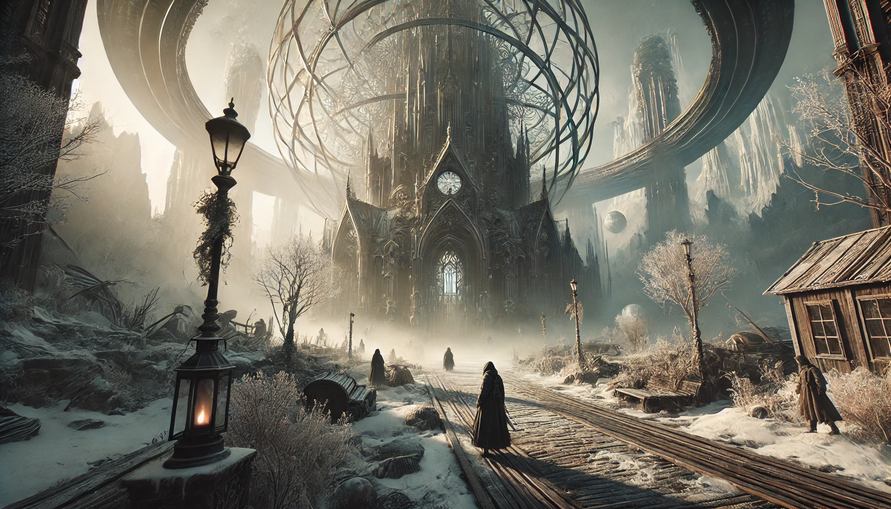 16:9 · 1792×1024 · midjourney-legacyThe composition centers on a snowy gothic cathedral, partly ruined, partly intact. Above and behind it, a massive armillary-sphere structure rises into the sky — concentric rings on different inclinations, like the celestial-sphere instruments Renaissance astronomers used to map planetary motion. Cloaked figures walk on the snowy ground in front of the cathedral. A cast-iron gas lamp burns at left. A small wooden shed sits at right. The sky is overcast white. Snow has buried most of the wagons and railings in the foreground.
