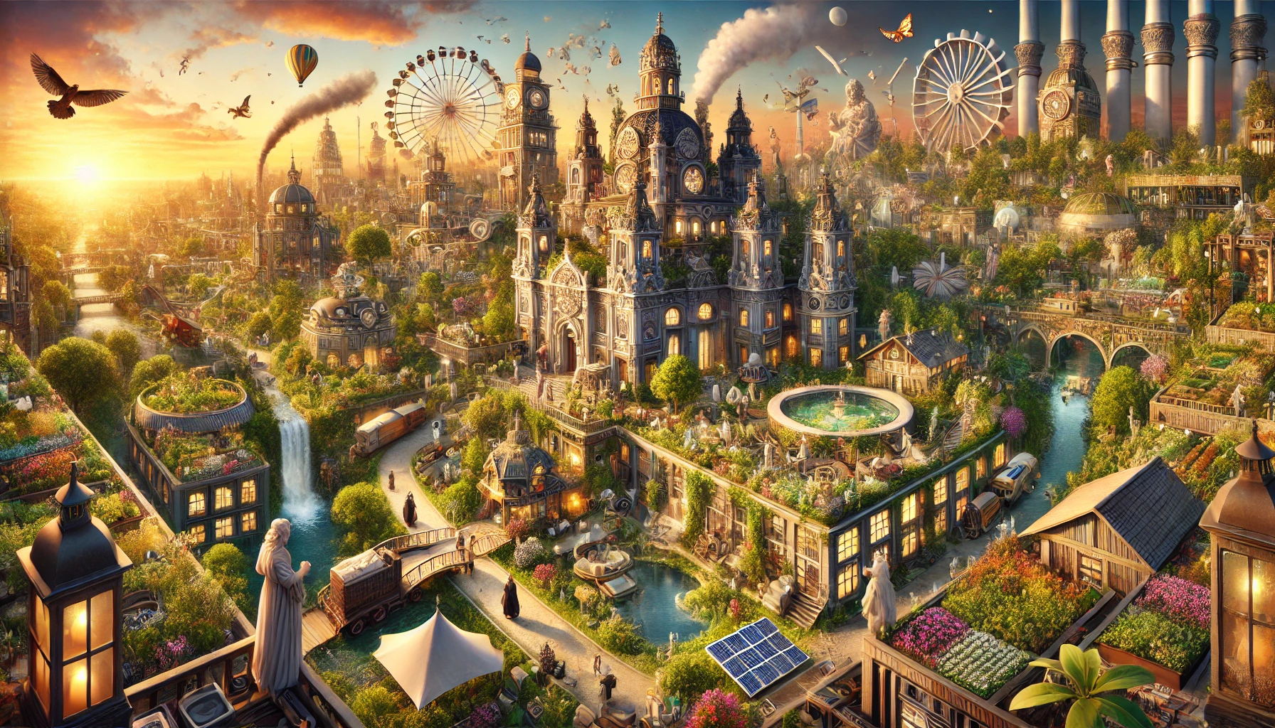 This image proposes a third path. Sustainability doesn't have to mean minimalism. The smokestacks are likely vents from a centralized district heating system that's serving a dense, walkable, gardened city. The hot-air balloons are recreational. The ornament is the point — a city that you would actually want to live in, that happens to be efficient by the back door of its own density. The robed figure with the lantern is a small claim about scale: this is a place you live in, not a place you visit.