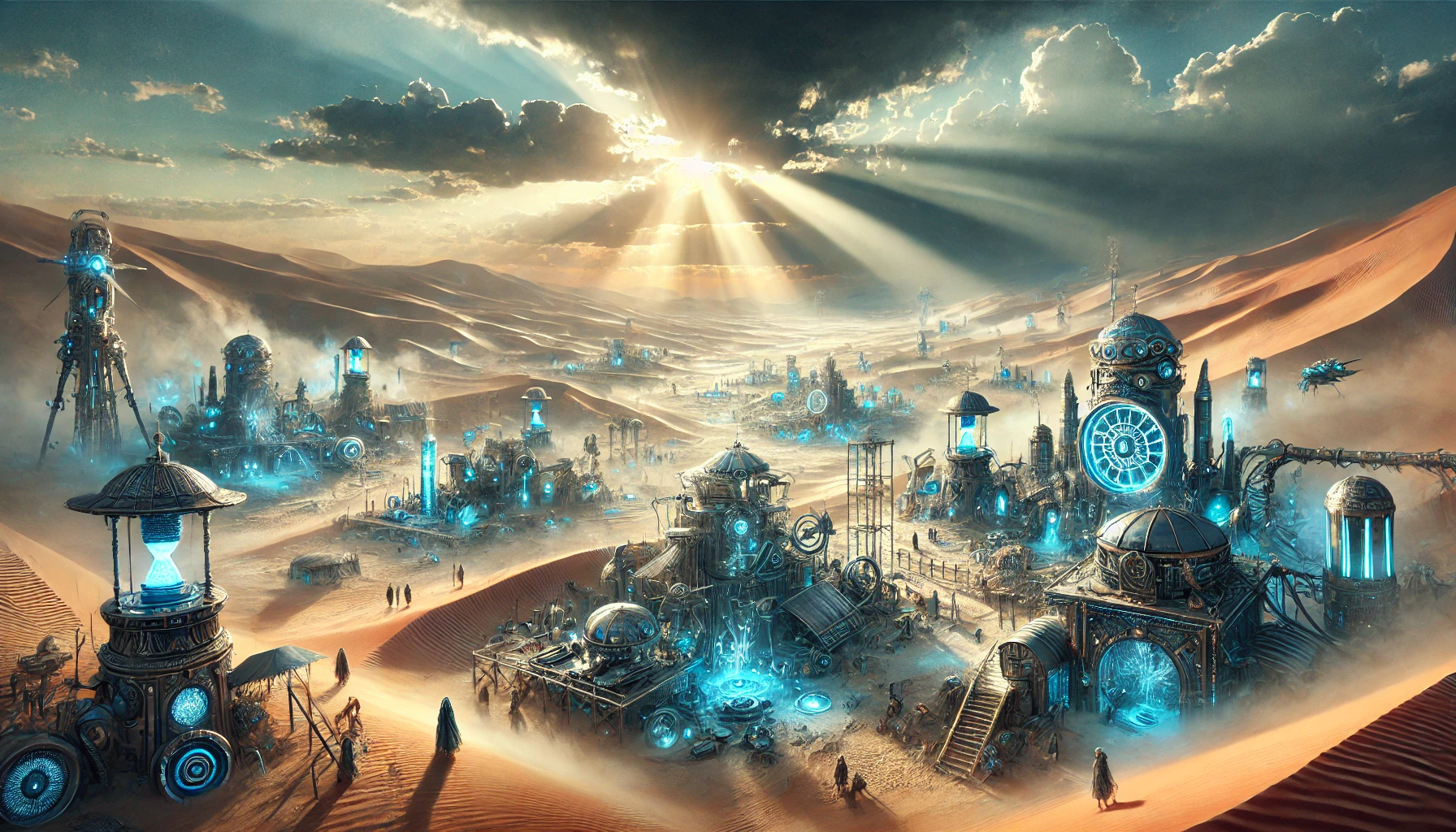 God rays break through the clouds in the upper third, picking out detail in the dune ridges. The figures walking the streets are scaled small — the architecture dwarfs them. That ratio is honest. Real desert architecture is human-scale at the doorway and inhuman-scale at the boundary; the city protects the body by making the climate refuse it. The cyan glow is the editorial flourish; the dunes are the structural truth.
