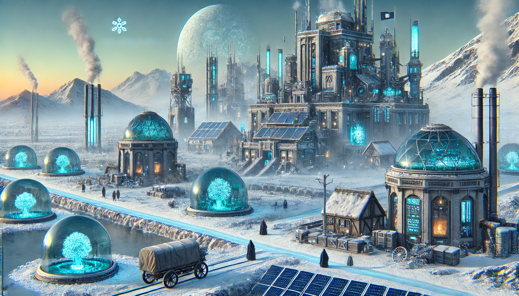 The brutalist central tower is the energy source — the cyan-lit pipes running between buildings imply district heating from a single central plant. Smokestacks vent steam, not smoke; in arctic engineering, that's the giveaway that it's geothermal or nuclear rather than fossil. The cloaked figures walking the streets are scaled small. The point of the image is that even when humans need this much engineering to live somewhere, they can. The trees, in particular, can. That's not minor.