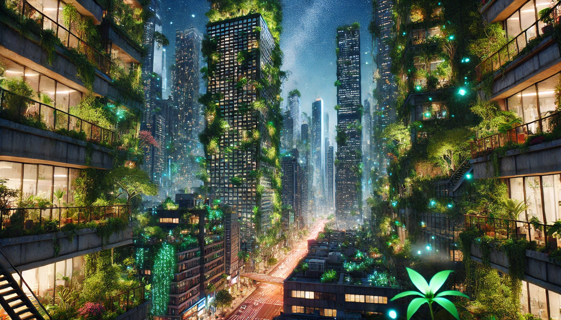 Two design choices keep the rendering from feeling Dubai-developer-glossy. First, the plants aren't decorative; they're structural. The vines wrap and load-bear in a way that real bioengineered Bosco-style facades don't yet do, but that biophilic-design researchers have proposed since the early 2010s. Second, the bioluminescent layer is at street scale, not skyline scale. The glow comes from below, from sidewalk-level plantings, not from the top of the towers. Cities that radiate light upward become Vegas; cities lit from the pavement up retain the nighttime intimacy of older urban centers — Marais, the Ginza side streets, Lisbon's Alfama.