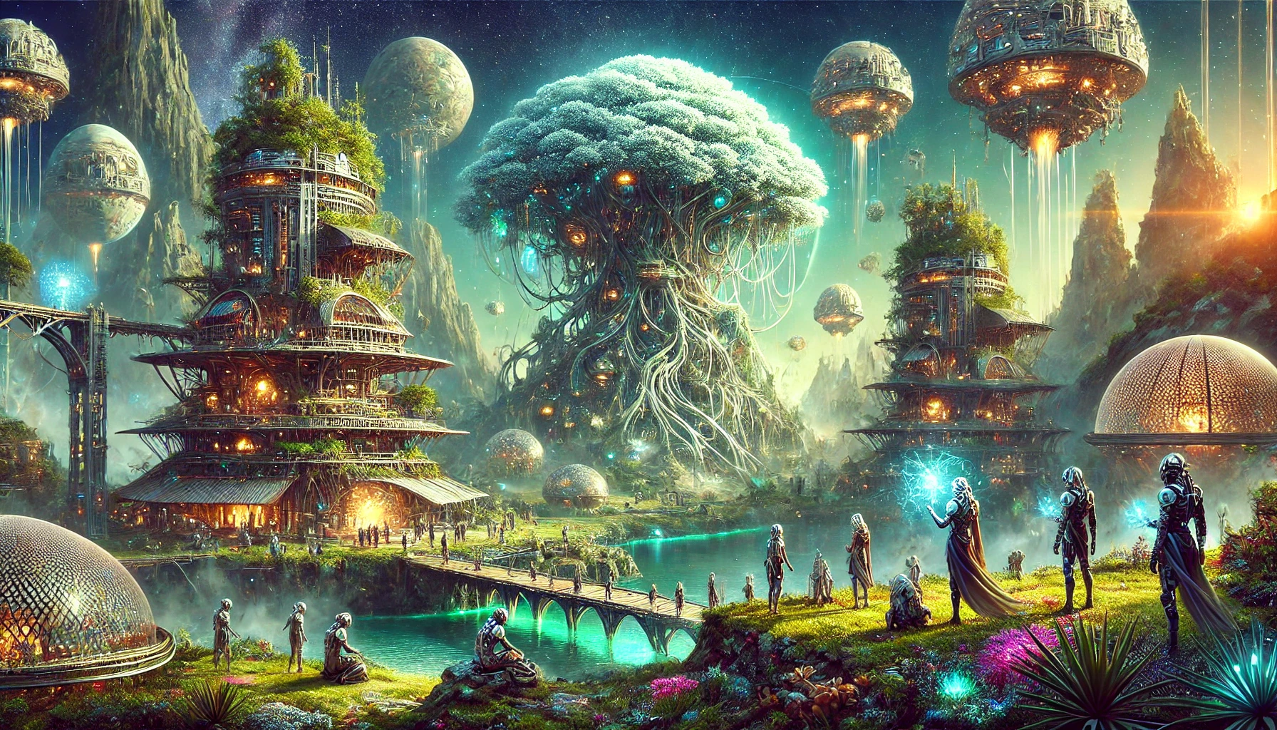16:9 · 1792×1024 · midjourney-legacyThe figures in the foreground of this image are not human. They're tall, slim, with exposed white-grey skin or robe-fabric that doesn't read as either; their facial features are simplified to a near-mask quality. Behind them, a giant tree with glowing mycelial roots dominates the middle ground. Pagoda-style buildings climb the cliffs on the left. Floating spherical platforms hang in the upper sky. Two visible moons. Crystal-blue and magenta flora line a stone bridge over a glowing teal river.