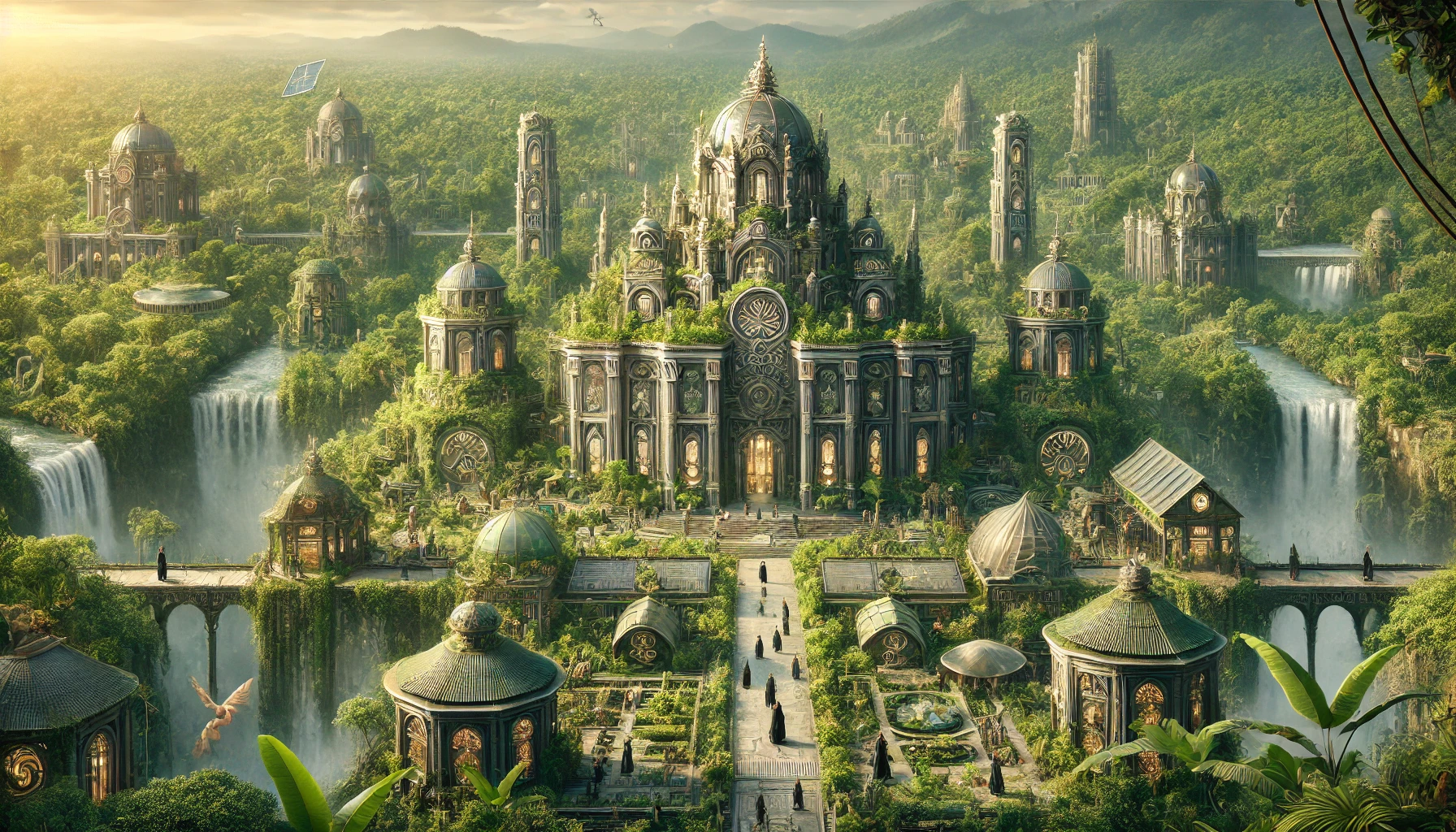 What the image stages is a city the jungle has chosen not to reclaim. Vines are visible on a few outer walls but never on the interior. The formal gardens are maintained. Waterfalls cascade off the city's edges into intact forest. This is restoration ecology more than conquest architecture: a society whose presence in the biome is conditional, and whose monumentalism is offered to the biome rather than imposed on it.