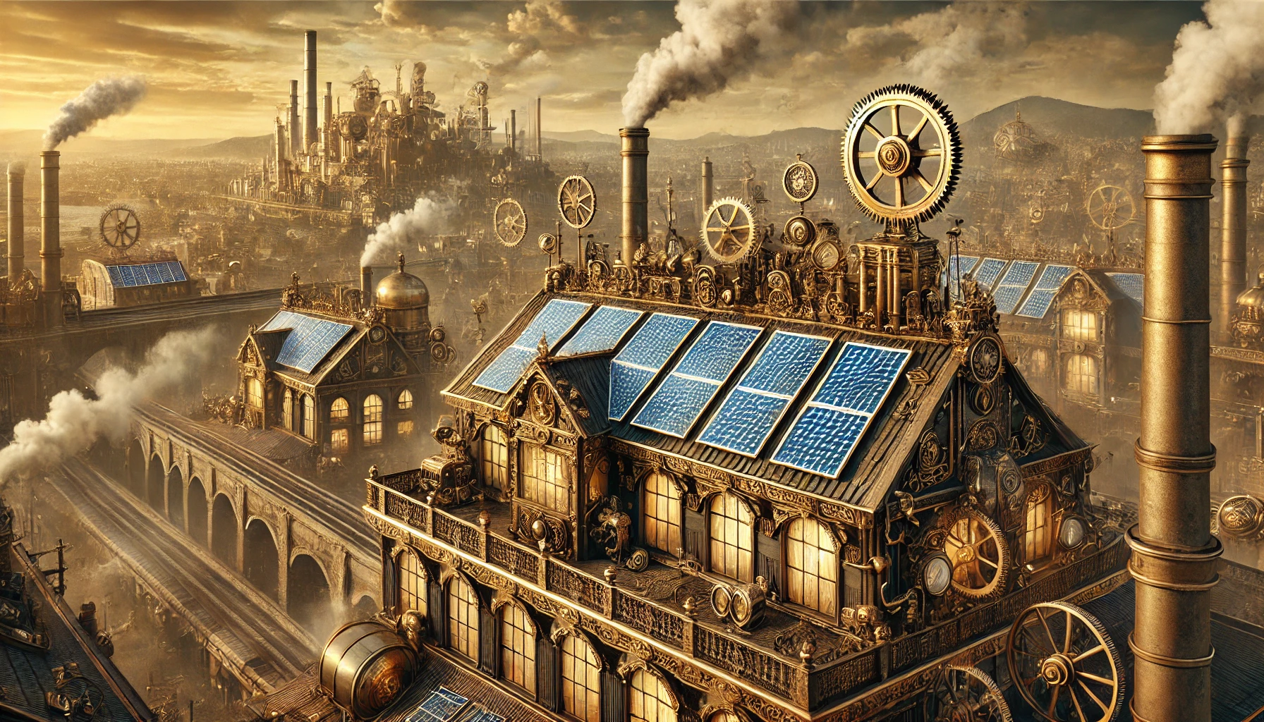 16:9 · 1792×1024 · midjourney-legacyOn the rooftops of a Victorian city that never gave up its brass and clockwork, solar panels sit in copper frames between the chimneys. The image proposes a quiet alternate history: what if the 19th-century industrial revolution had skipped the long detour through coal and steam and gone straight to photovoltaics? The buildings are still ornate — pediments, gas lamps, wrought iron balconies — but their power source is sunlight, not the fossil energy that defined the era we actually got.